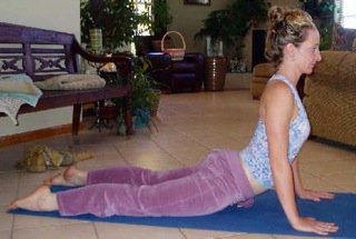 Inhale. Press the pubic bone for a strong pelvic tilt into Cobra stretching out through spine.