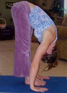 Exhale as you drop into the forward bend, draw the lower belly into your core, softening the knees, lengthening the spine.